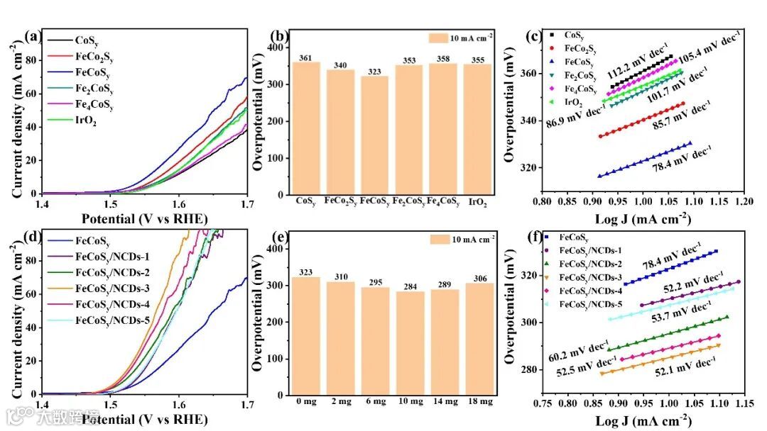 当Fe:Co摩尔比为1:1时, FeCoSy展现了较优的电催化OER性能,在10 mA cm-2下具有相对较低的过电势η10 = 323 mV,优于其他比例的FeCo硫化物以及商用贵金属催化剂(IrO2)。该结果表明,引入适量的Fe元素可以有效地提高催化剂的OER活性。此外,添加NCDs也可以显著提高FeCoSy的电催化OER性能。当添加至10 mg时,FeCoSy/NCDs-3复合材料提供了最佳的电催化OER性能,在10 mA cm-2下具有最低的过电势η10 = 284 mV。