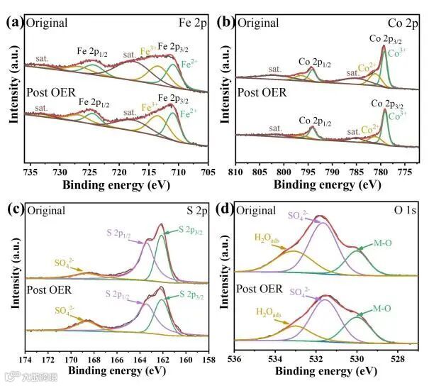 图7. 初始和OER测试后FeCoSy/NCDs-3复合材料的(a)Fe 2p、(b)Co 2p、(c)S 2p和(d)O 1s的高分辨率XPS光谱。