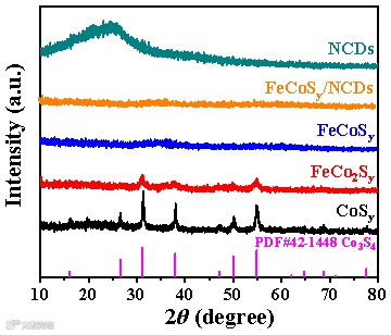 引入Fe元素后,FeCo2Sy具有与CoSy相似的晶体结构,但其衍射峰相对较弱。当Fe元素的比例进一步增加时,FeCoSy的衍射峰几乎消失,表明形成了非晶相。这说明Fe元素的引入可以显著影响产物的结晶性,使硫化物的结晶度降低、甚至无定形化。FeCoSy/NCDs复合材料呈现出基于纳米片的分级结构。Fe、Co、S、N和C元素在整个纳米片分级结构中的分布高度均匀,这证实了FeCoSy/NCDs复合材料的成功制备。