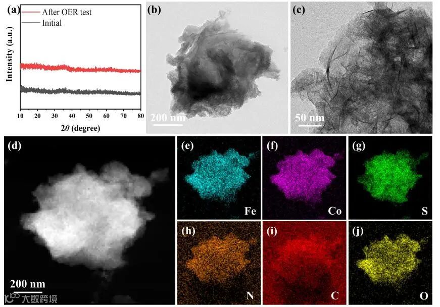 图6. OER测试后FeCoSy/NCDs-3复合材料的(a)XRD图谱、(b,c)TEM、(d-j)HAADF-STEM以及EDS mapping图。