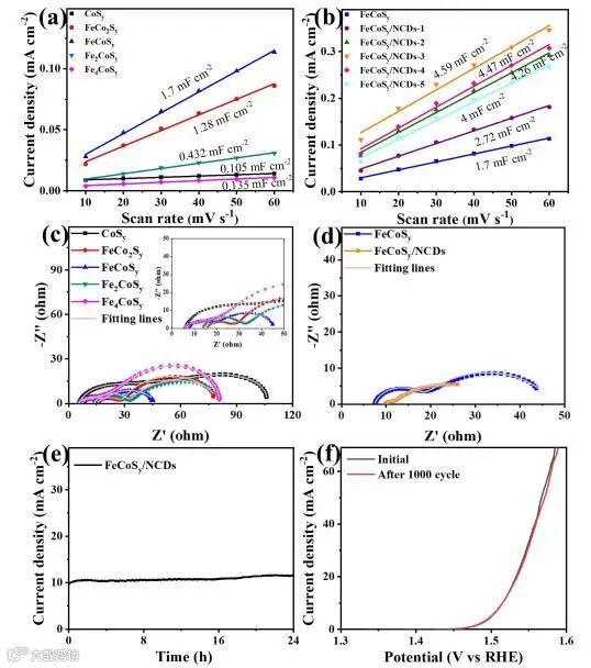 该文章通过简单的一锅溶剂热法成功合成了FeCoSy/NCDs复合材料。得益于FeCoSy的低结晶度以及与NCDs之间的协同效应,其表现出显著增强的电催化OER性能和良好的催化稳定性。同时,不同于普通的金属硫化物电催化剂,该复合材料在OER测试后可以很好地保留其形态、组成和结构。