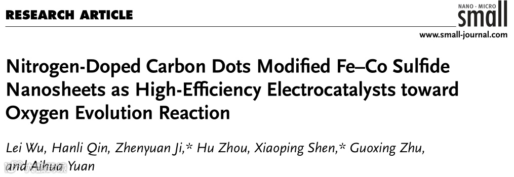 基于此,江苏大学沈小平教授、季振源副教授合作在国际知名期刊Small上发表题为“Nitrogen-doped carbon dots modified Fe-Co sulfide nanosheets as high-efficiency electrocatalysts towards oxygen evolution reaction”的文章。