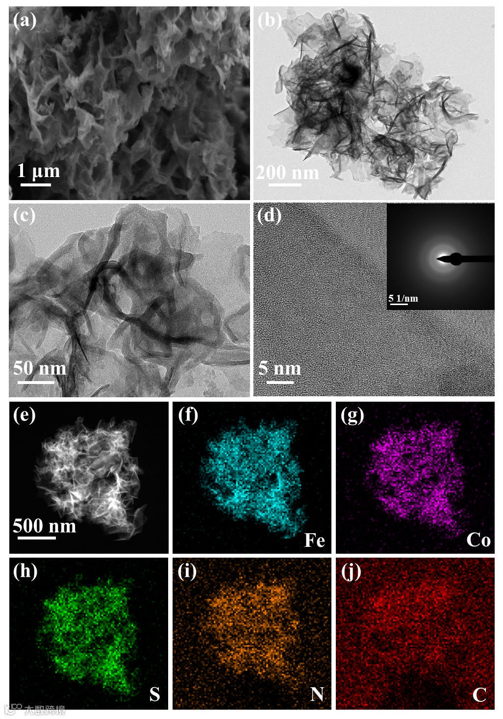 图3. FeCoSy/NCDs复合材料的(a) SEM,(b,c) TEM,(d) HRTEM和SAED,(e-j) HAADF-STEM以及EDS mapping图。