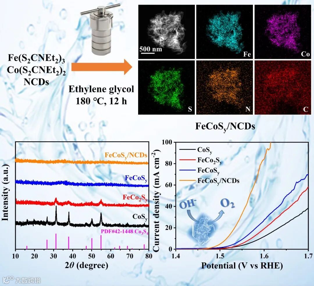 图1. 文章TOC,得益于低结晶度和协同效应,FeCoSy/NCDs复合材料表现出显著增强的电催化OER性能。