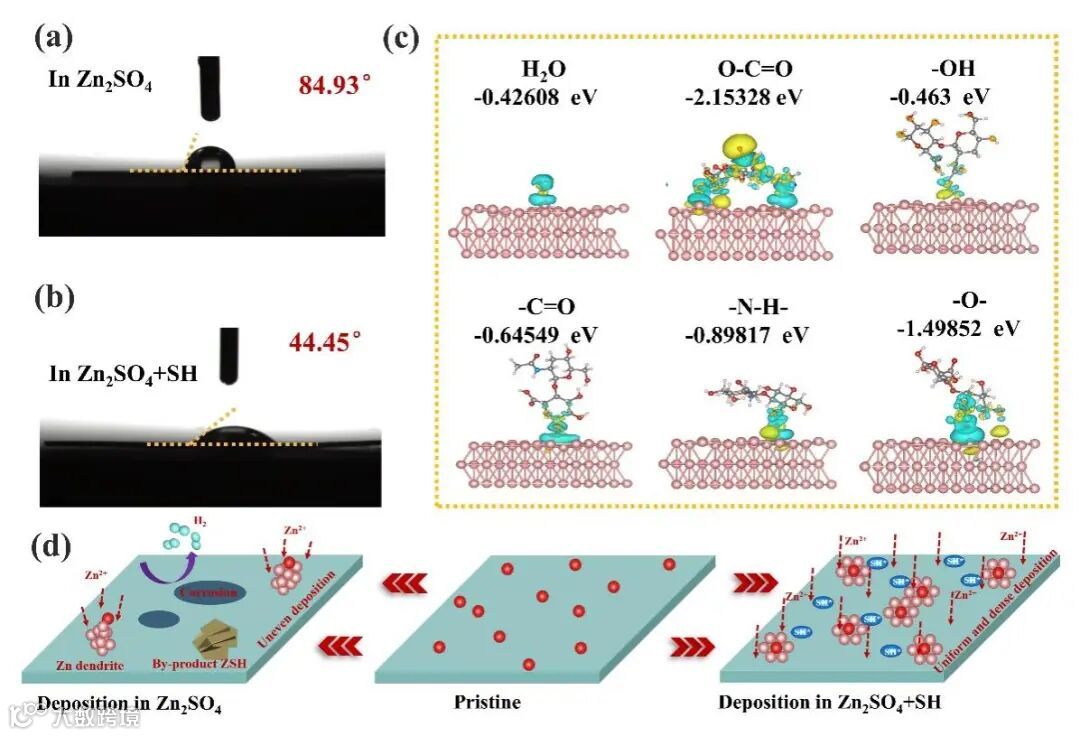 图 3. 锌-电解液接触角 (a) 2M ZnSO4 和 (b) 2M ZnSO4+SH。(c) 锌 (002) 晶面与水和 SH的官能团的吸附能的 DFT 计算。(d) 锌的沉积机理模型。