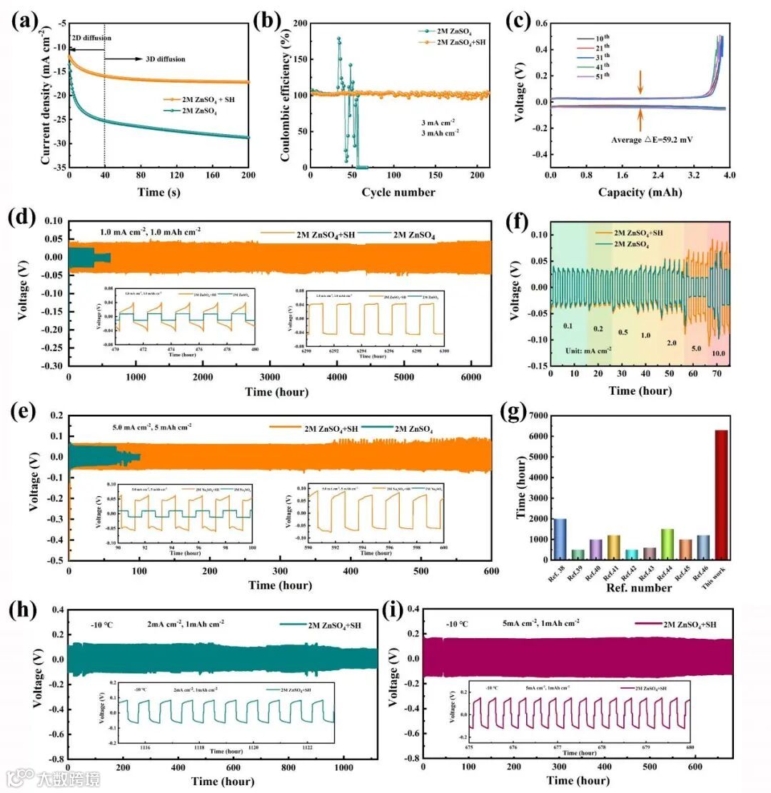 图 4. (a) Zn 阳极的计时电流测试。(b) 不同电解质体系中 Zn||Ti 不对称电池的库仑效率;(c) 不同周期下的相应电压-容量曲线;(d) 1 mA cm-2/ 1 mAh cm-2 和 (e) 5 mA cm-2/ 5 mAh cm-2 下 Zn||Zn 对称电池的运行时间。(f) Zn||Zn 对称电池在不同电解质中的倍率性能,以及 (g) 与其他文献的比较。含 SH 添加剂的 Zn||Zn 对称电池在 (h) 2 mA cm-2/ 1 mAh cm-2 和 (i) 5 mA cm-2/ 1 mAh cm-2 条件下的长期低温性能。