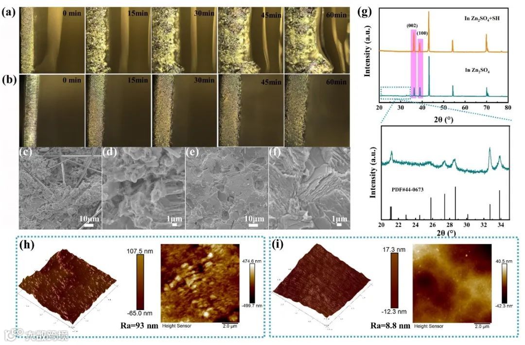 图 2. 在不同电解质中的原位光学显微镜图像:(a) 2M ZnSO4 和 (b) 2M ZnSO4+SH。运行 50 小时后的 SEM 图像:(c-d) 在 2M ZnSO4 中,(e-f) 在 2M ZnSO4+SH 中;(g) 相应的 XRD 图样和局部放大图;Zn 的原子力显微镜图像 (h) 在 2M ZnSO4 中,(i) 在 2M ZnSO4+SH 中。