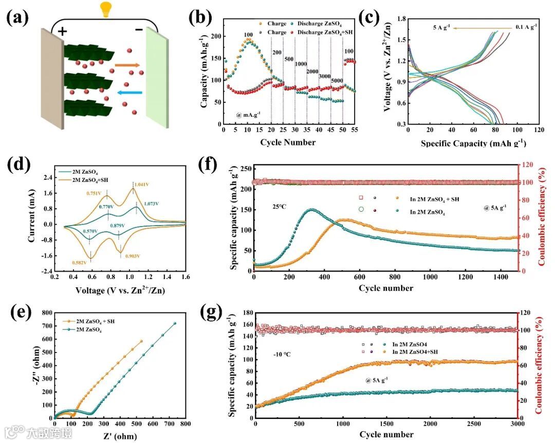图 5. 不同电解质中 Zn||V2O5 电池的电化学性能比较。(a) 电池示意图。(b) 倍率性能。(c) 在 2M ZnSO4+SH 中不同电流密度下的充放电曲线。(d) 0.1 mV s-1 时的 CV 曲线。(e) EIS 谱。电流密度为 5 A g-1 时的长期循环性能:(f) 25℃;(g) -10℃。