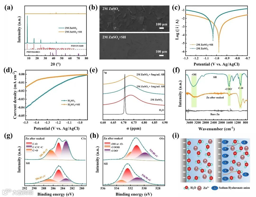 图 1. 在不同电解质中浸泡后的 Zn:(a)XRD;(b) 在2M ZnSO4 和 2M ZnSO4+SH 中的SEM。(c) Tafel曲线; (d) Zn阳极的线性扫描伏安曲线 (LSV), (e) 不同 SH 含量的电解质的 NMR 谱。(f) Zn 箔、SH 和浸泡后 Zn 的傅立叶变换红外光谱。(g) C 1s 和 (h) O 1s 的 XPS 高分辨谱。(i) 加入 SH 前后的 EDL 界面结构模型。