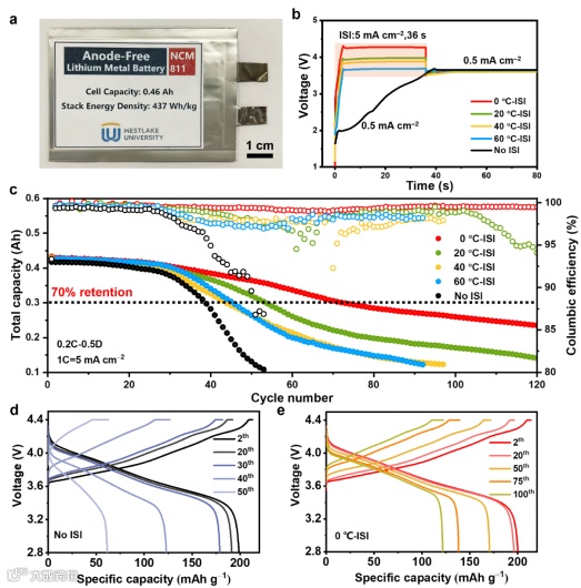 图 5 原位植晶对437 Wh kg-1 Cu||NCM811无负极软包锂电池的电化学性能影响。