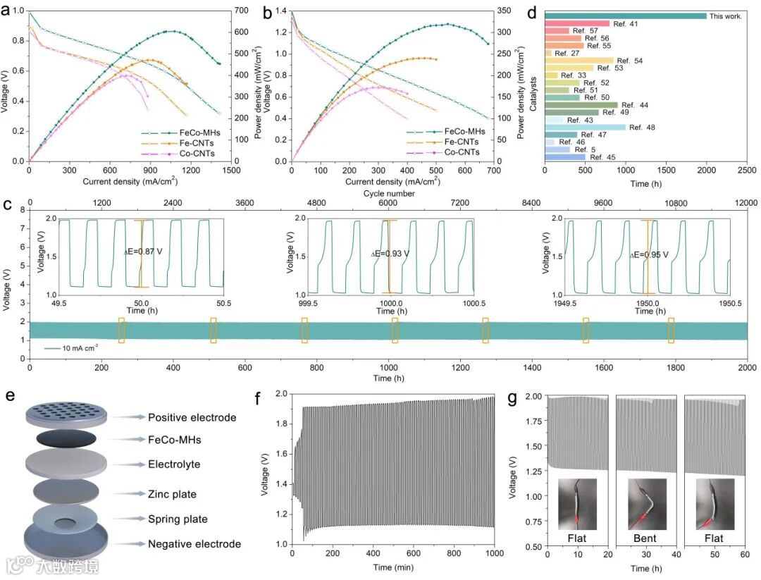 将FeCo-MHs催化剂作为空气阴极装备到阴离子交换膜燃料电池中,其功率密度达到了604.9 mW cm-2。应用于锌空电池中,其功率密度高达319.7 mW cm-2。值得注意的是,FeCo-MHs空气阴极具有出色的锌空电池充放电循环稳定性,在10 mA cm-2电流下循环达2000小时而没有明显的电压衰减,FeCo-MHs催化剂的充放电稳定性明显优于其他报道的电催化剂,同时,其也有应用于纽扣及柔性锌空电池中的潜力。