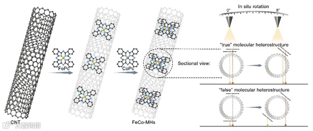 图1:两步特异性吸附策略制备FeCo-MHs催化剂,并利用原位转角操作辨别“真/假”分子异质结。