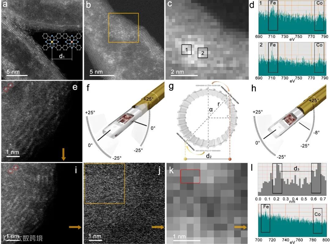 研究人员首先利用两步特异性吸附的策略,在无煅烧条件下,选用结构明确的FePc/CoPc为金属前驱体,制备了FeCo-MHs分子异质结构催化剂。然后分析了辨别“真/假”分子异质结的表征手段和结果。单个FePc/CoPc分子的直径约为1.3nm,当FePc和CoPc水平相邻放置的时候,其中心Fe和Co之间的距离约为0.92nm,这就意味着当电镜中两个金属原子的距离小于0.92nm时,FePc和CoPc分子可能形成局部/完全相互堆叠的构型(即形成FeCo分子异质结构)。考虑AC-HAADF-STEM所记录的样品图像是沿着透射电子束的方向的,为了排除AC-HAADF-STEM图像中“假”分子异质结构的存在,研究人员利用AC-HAADF-STEM原位转角8°的操作,结合损失电子能谱表征结果,直接辨认了单个“真”FeCo分子异质结构。