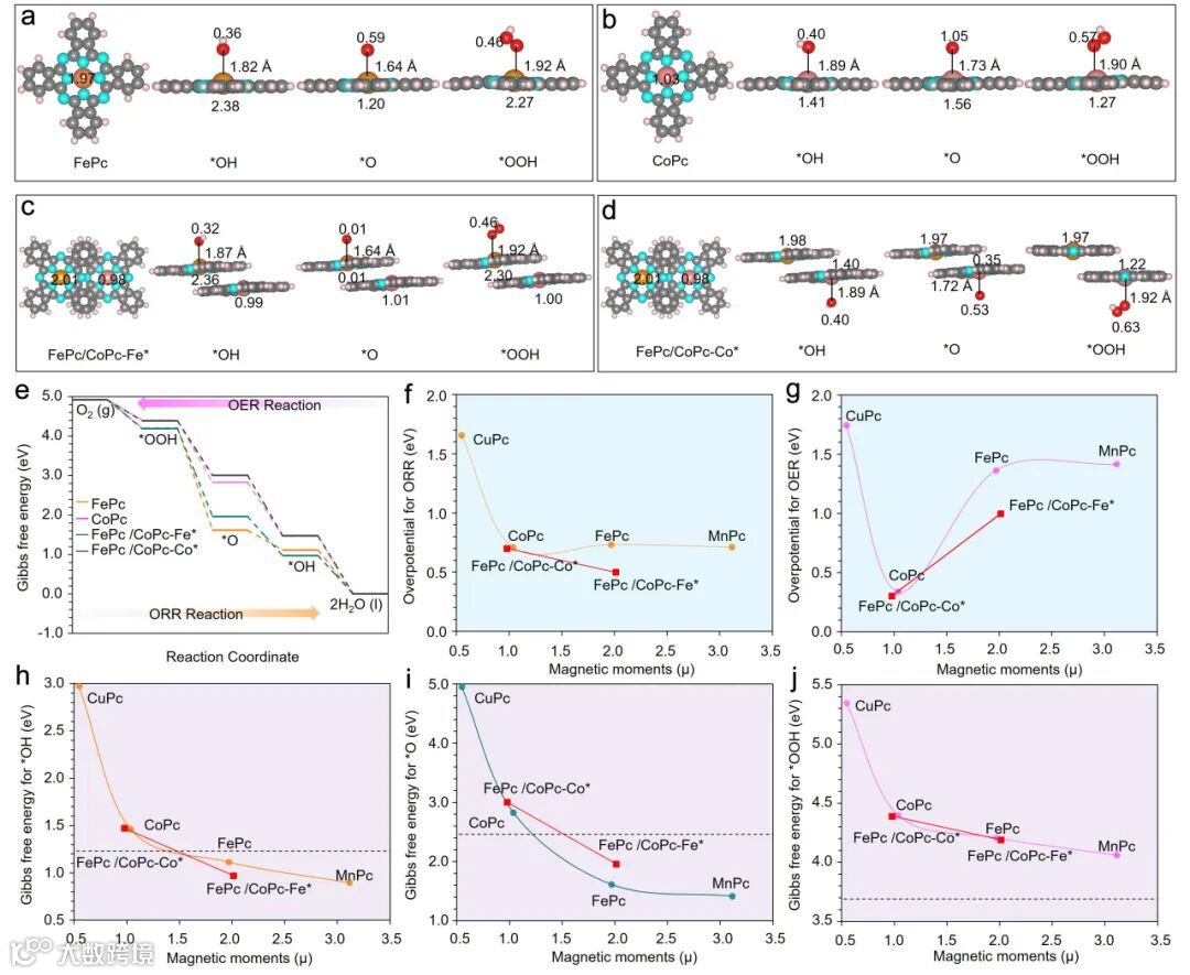 研究人员分别对不同堆叠情况的FePc/CoPc的异质结构上Fe*和Co*位点的ORR以及其对应的逆反应OER的吉布斯自由能进行了计算,同时也探究了MPc (M = Fe, Co, Mn, Cu) 酞菁结构的ORR/OER活性。结果发现FePc/CoPc的异质结构上Fe*位点为ORR反应的主位点,Co*位点作为OER反应的主位点。研究人员发现一个有趣的现象,对于单分子MPc,其活性中心的磁矩与ORR/OER反应的过电位存在近似的火山曲线函数关系,这表明活性位点的磁矩数值是可以作为ORR/OER反应的一个很好的描述符。FePc/CoPc异质结构的形成同时调节了Fe位点(1.97→2.01)和Co位点(1.03→0.98)的磁矩,使其ORR与OER性能得到进一步提高。