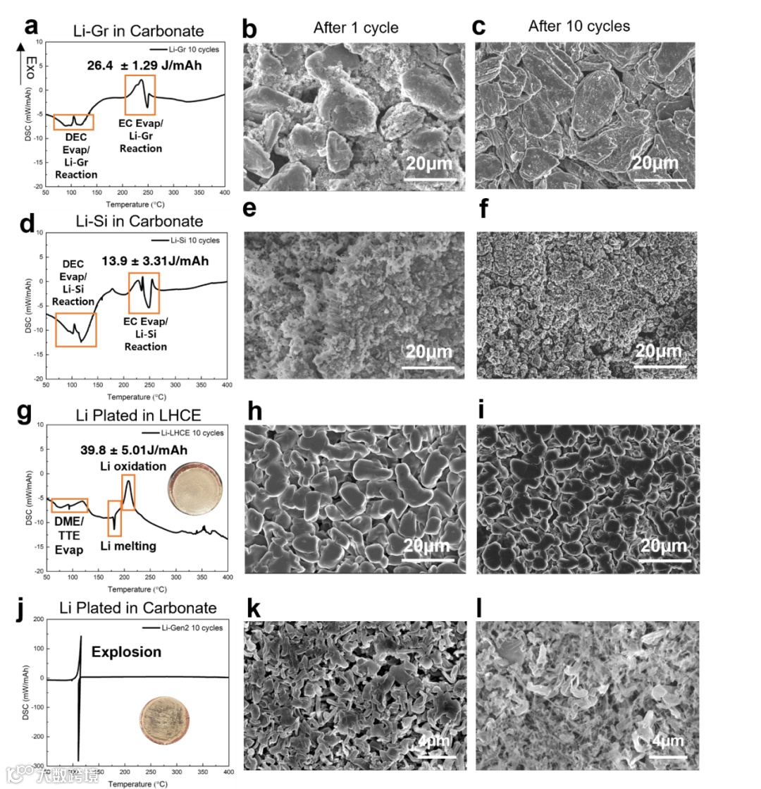 图3显示了循环10次后锂化石墨,锂化硅和锂金属负极的DSC曲线和形貌。图3a展示了10圈以后锂化石墨的情况,与充放电一次之后的锂化石墨样品类似,大多数DSC峰与电解液溶剂的蒸发有关。同时,如图3b,c所示,石墨表面似乎有一些SEI积累,层状表面形貌在循环10次后消失,小的放热峰(约100和230℃)可能与溶剂蒸发过程中锂化石墨电极表面SEI氧化有关。在循环10次后锂化硅负极中也发现了类似的趋势(图3d-f),在同一温度范围内也发现了两个放热峰(约100和230℃),SEI积累在硅表面上也很明显。总体而言,锂化硅和锂化石墨的反应性相对较低,在加热过程中没有观察到大的放热峰。图3g显示了循环10次后LHCE电解液中沉积锂的DSC曲线,由于LHCE的优越性能,沉积的锂仍保持致密的形貌。此外,大多数溶剂在锂熔点之前就已经蒸发。因此,LHCE中金属锂的热响应仍然相对较低。然而,对于碳酸盐中的沉积锂,电极表面积聚了大量的苔藓状锂(图3k,l和图3j的插图)。由于碳酸酯电解液的较低库仑效率(CE),电极上积累了大量的纳米级非活性锂,这些纳米级的非活性锂的积累在加热过程中展现了非常强的反应活性。最终发生了爆炸。