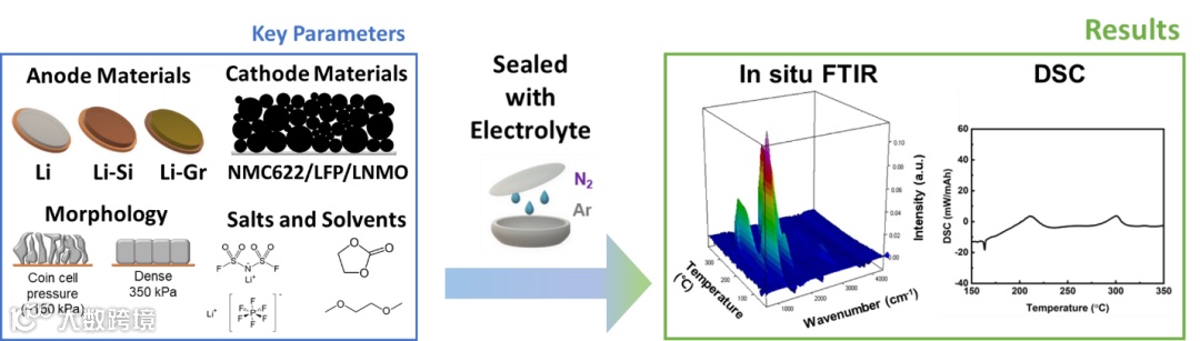 综上所述,本文使用DSC和原位FTIR技术比较了锂化石墨,锂化硅和金属锂负极的反应性。研究发现,凭借锂金属致密的形态,稳定的正极材料和电解液,锂金属全电池的安全性可以得到很好的控制(图7)。作者发现,尽管锂金属的形貌对于性能至关重要,但是在使用锂金属负极时,正极和电解液的热稳定性也是需要重点考虑的因素。通过使用热稳定性更高的正极材料,如LFP和LNMO,可以提升锂金属全电池的热稳定性。此外,电解液锂盐的分解也必须严格控制。本工作研究的控制锂金属反应性的关键参数可应用于未来商用锂金属全电池的优化设计。