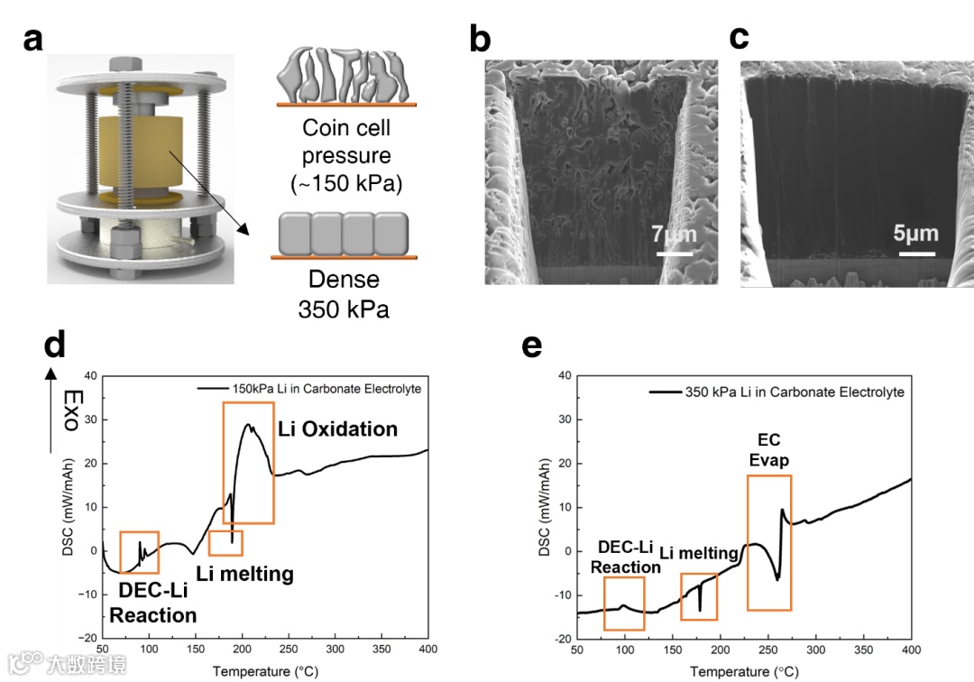 图5. 不同压力下沉积锂所产生的形貌,以及其DSC 曲线。