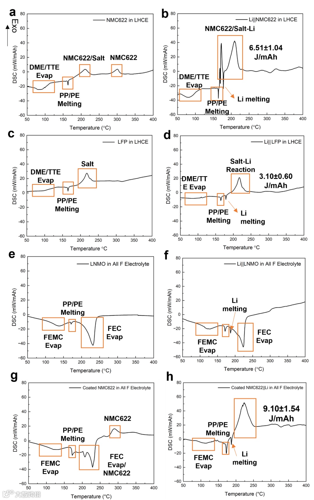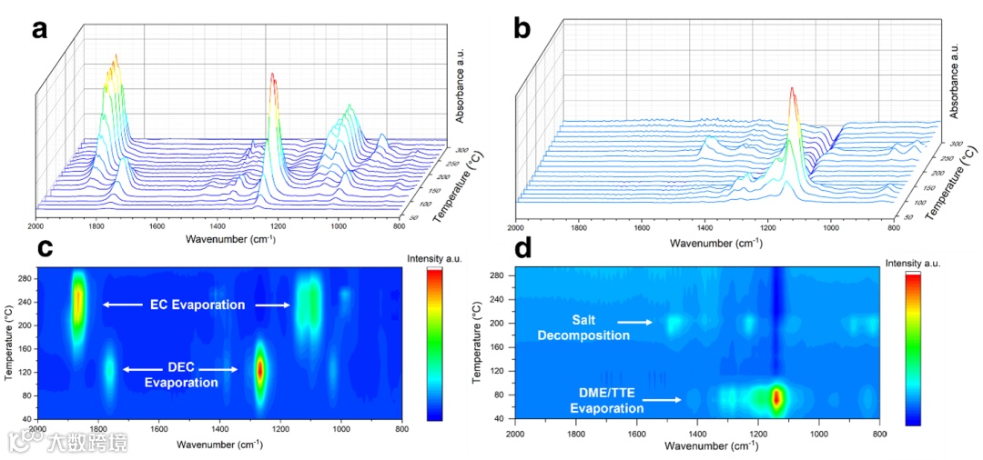 文章又展示了利用原位FTIR研究电解液的热稳定性。图4a,c显示了碳酸酯电解液样品在DSC中的FTIR光谱,大多数峰与DEC和EC的蒸发有关。与碳酸酯电解液类似,由于TTE和DME的沸点较低,LHCE电解液中的溶剂在120℃之前蒸发(图4b,d)。因此,锂金属的氧化主要是由残余有机成分和电解液中的锂盐引起的。上述结果说明,未来的电解液设计不仅要研究溶剂的阻燃特性,还需要关注电解液锂盐的热稳定性。在LHCE中,因为盐的FSI-阴离子中的S-N键断裂造成了盐的分解,会氧化熔融的Li,与脱锂的正极相互作用,最终引起热量的产生。