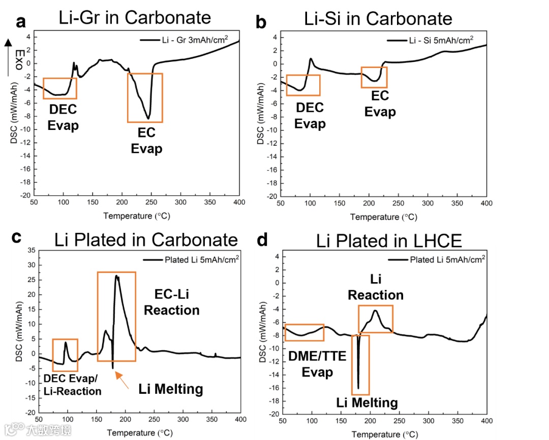 作者先研究了在普通碳酸酯电解液和局部高浓电解液中锂化石墨,锂化硅合金和沉积锂的DSC曲线。在Li-Gr和Li-Si中,当在惰性氛围下加热至400℃时,锂化石墨和锂化硅样品中没有明显的放热峰,大多数吸热峰与电解液溶剂的蒸发有关(图2a,b)。然而,当碳酸酯电解液中的沉积锂在DSC测量期间,两个放热峰分别与DEC和EC溶剂的蒸发重叠(图2c)。放热反应可能是由熔化的锂与正在蒸发的溶剂快速反应引起的。图2d显示了LHCE电解质中沉积锂的DSC曲线。DME和TTE溶剂大多在100℃之前蒸发。在180℃左右也显示出一个尖锐的吸热峰,这表明锂在加热过程中大部分被熔化而不是被氧化。锂完全熔化后可以观察到一个小的放热峰,这与电解质液的分解有关。