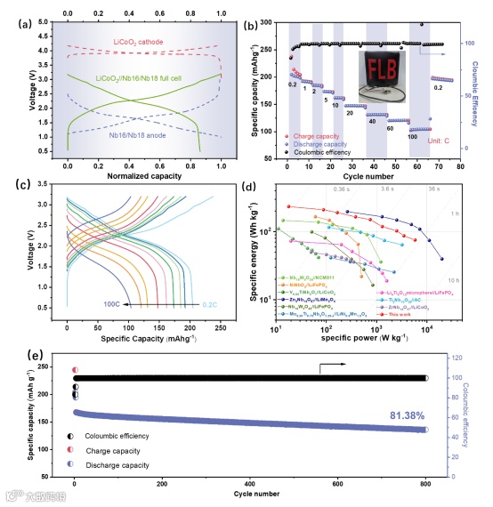 为了探究Nb16/Nb18的实际应用,以Nb16/Nb18为负极,以LiCoO2为正极组装全电池进行测试。Nb16/Nb18//LiCoO2在0.2C(1C=79.9 mAhg-1)倍率下放电比容量为202 mAhg-1,而 100C下,全电池的可逆比容量仍有104 mAhg-1。Nb16/Nb18//LiCoO2全电池在36 W kg-1和12480 W kg-1的功率密度下,质量能量密度分别为317 Wh kg-1和158 Wh kg-1,优于大多数铌基氧化物组装的全电池数据。全电池在10 C下进行800次循环。首圈比容量为167.6 mAhg-1,800次循环后比容量为136.4 mAhg-1,容量保持率为81.3%。结果表明Nb16/Nb18//LiCoO2全电池具备实际应用的潜力。