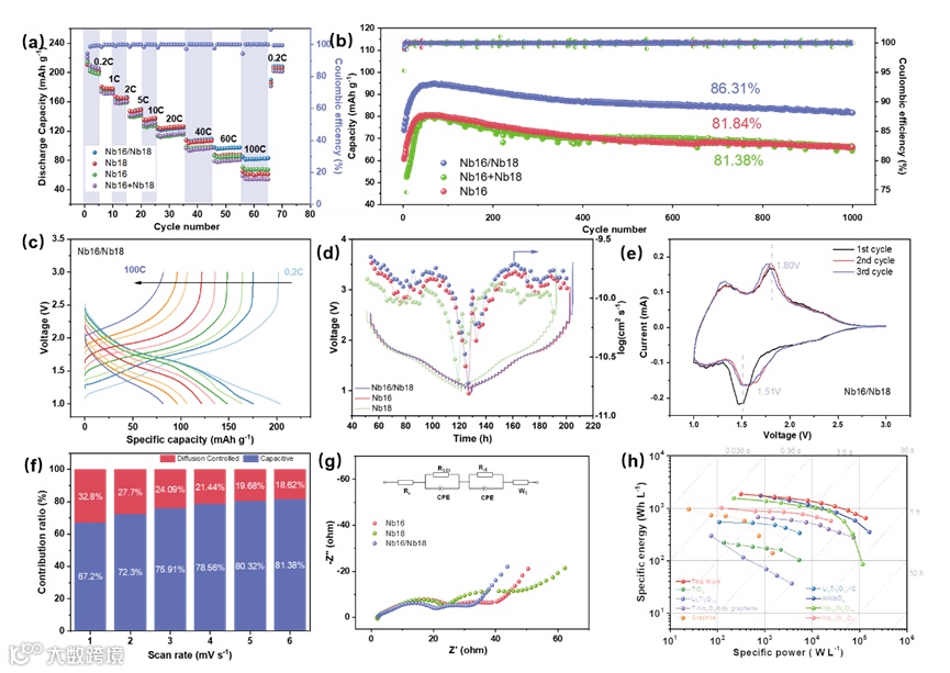 得益于异质结构,Nb16/Nb18的电化学性能优于Nb16、Nb18,以及Nb16与Nb18混合物(Nb16:Nb18质量比 = 0.85:0.15):活性材料负载量为1.93 mg cm-2的Nb16/Nb18在100 C (1C=171 mAhg-1)时的可逆比容量分别为85 mAhg-1;100 C循环1000圈, Nb16/Nb18的容量保持率为86.3%(以最高比容量计算),而Nb16的容量保持率仅为81.84%,表明异质结构材料Nb16/Nb18具有较好的循环稳定性;对比恒流充放电曲线及CV曲线,Nb16/Nb18具有更小的极化;采用恒流间歇滴定法(GITT)测定Li+扩散系数(DLi+),Nb16/Nb18的变化范围为3.34×10-11 ~ 2.24×10-10 cm2 s-1;进一步验证了异质结构材料具有更好的倍率性能。通过不同扫速CV曲线计算,Nb16/Nb18的赝电容比例,拟合b值均高于Nb16;EIS结果拟合值RSEI和Rct值分别为23.68和4.761 Ω,低于其他材料,表明异质结构可以增强电荷传递动力学,降低界面阻力,促进Li+扩散。基于电极的高振实密度2.16 mg cm-2,Nb16/Nb18电极在8057W L-1的功率密度下,体积能量密度为1404 W h L−1,高于大部分已报道嵌入型材料。
