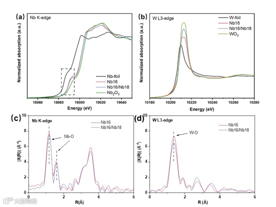 通过XANES表征发现, Nb16/Nb18中Nb的总配体比Nb16低,说明八面体NbO6存在局部畸变或缺陷。在EXAFS中Nb16/Nb18中Nb-O和W-O键对应峰在虚线处明显向右偏移,说明在Nb16中引入Nb18后,Nb-O和W-O键变长,结合XRD精修结果,结晶剪切面中共边八面体的Nb(W)-O键长明显增加,证明NbO6/WO6的畸变进一步加深。Nb(W)-O键的延长增加了块结构单元之间的间隙,降低了锂离子的扩散势垒,进一步证明异质结构Nb16/Nb18有利于Li+的扩散。