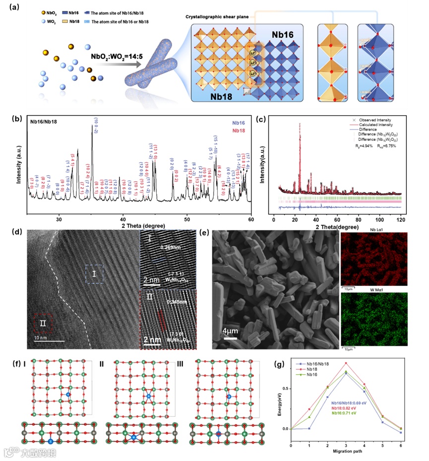 近年来,研究人员也在寻求突破,众多学者先后报道了TiNb2O7、Nb2O5等铌基氧化物,作为兼具高能量密度和高功率密度的材料,是高功率锂离子电池负极的发展方向之一。铌钨氧化物作为嵌入型电极材料,倍率性能优异;材料密度高,循环过程中结构稳定,优于转换型、合金型负极;嵌锂电位高,安全性好,是一种新型的超高功率负极材料。对于具有Wadsley-Roth 结晶剪切面结构的铌钨氧化物,材料导电率不是限制其倍率性能的主要因素,尤其针对实际应用的微米级颗粒,锂离子在固相中的扩散才是限制倍率性能的“决速步骤”。据文献报道,Wadsley-Roth 结晶剪切面结构中块结构单元之间的Li+的迁移势垒最高。因此,我们提出一种观点:降低最高Li+迁移势垒能够进一步提高材料的倍率性能,实现超快锂离子的存储。