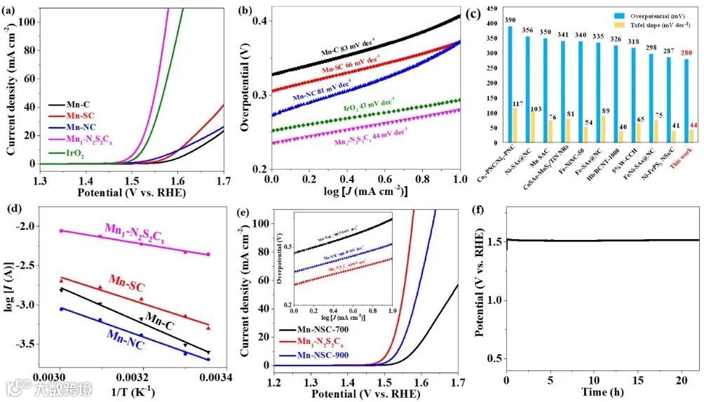 在1 M KOH中测试了Mn-C、Mn-SC、Mn-NC和Mn1-N2S2Cx的OER活性(图 3)。在800℃下高温退火获得的催化剂Mn1-N2S2Cx显示出最好的OER活性,过电位为280 mV,Tafel斜率为44 mV/dec-1,电化学活性比表面积(ECSA)为282 cm2,活化能(Ea)为16.9 kJ mol-1,表明N和S配位极大地改善了锰单原子位点的活性。