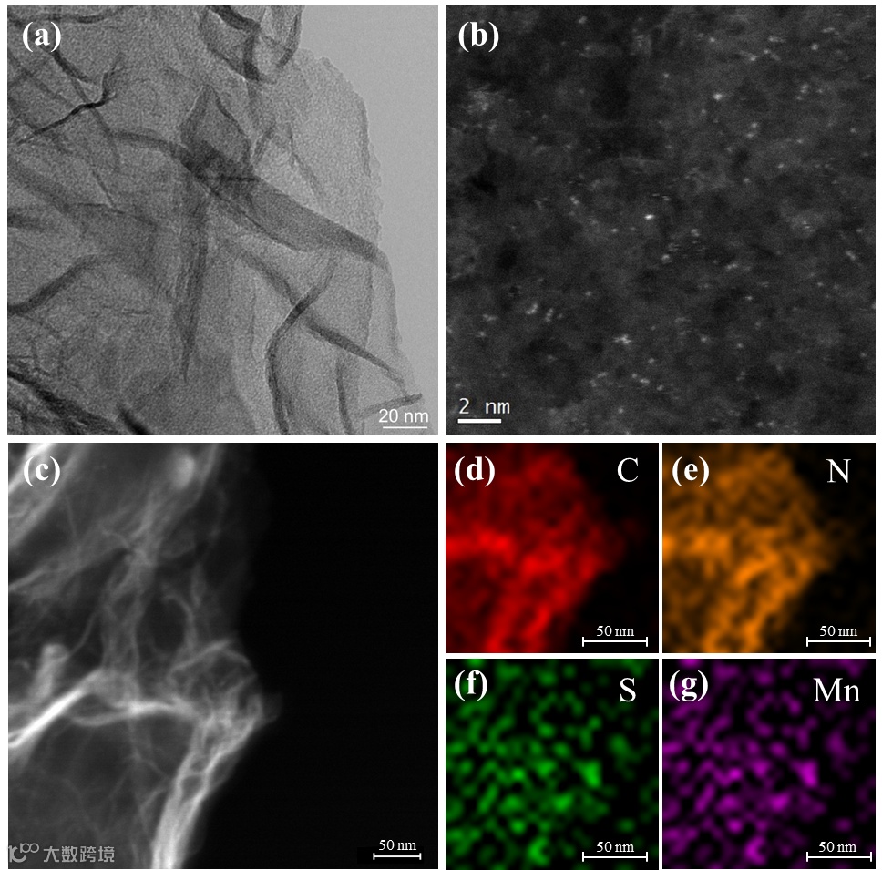 采用扫描透射电镜(STEM)和高角度环形暗场扫描透射电镜(HADDF-STEM)分析样品形态(图一)。HAADF-STEM图像中的亮点表明,Mn单原子以孤立的单原子而不是簇的形式成功地加载到石墨烯表面。能量色散X射线能谱(EDS)进一步证明了Mn、N和S元素的均匀分散。