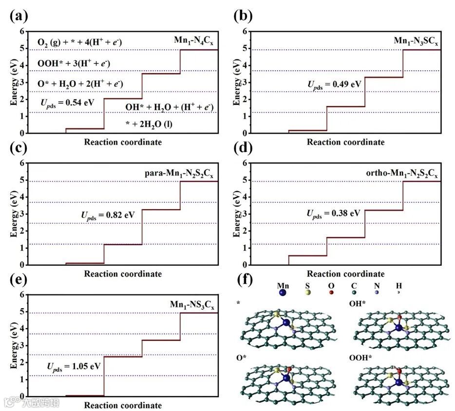 理论计算表明,Mn1-N2S2Cx和Mn1-NS3Cx的催化位点均为非平面对称的,这是硫原子掺杂的结果(图4)。在计算过程中考虑两个硫原子掺杂的对位和邻位结构,结果表明Mn1-N3SCx、para-Mn1-N2S2Cx和ortho-Mn1-N2S2Cx的OER限速步为O*→OOH*,且ortho-Mn1-N2S2Cx具有最低的催化能垒,这与实验结果一致。