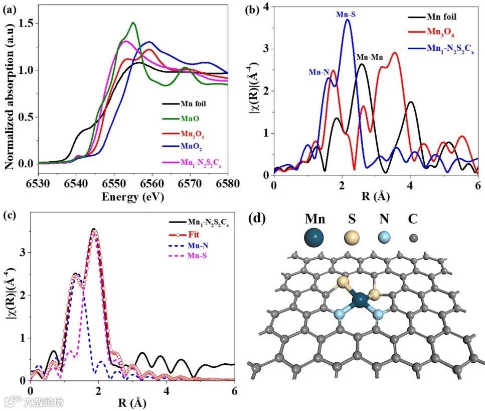 利用x射线吸收精细结构(XAFS)对Mn的化学环境进行了进一步分析(图二)。最佳拟合结果表明,Mn-N和Mn-S的键长分别为1.88±0.03 Å和2.24±0.04 Å,配位数分别为2.3±0.5和1.7±0.5。优化的结构模型为Mn1-N2S2,其中S的存在导致Mn周围的变形(图二d)。