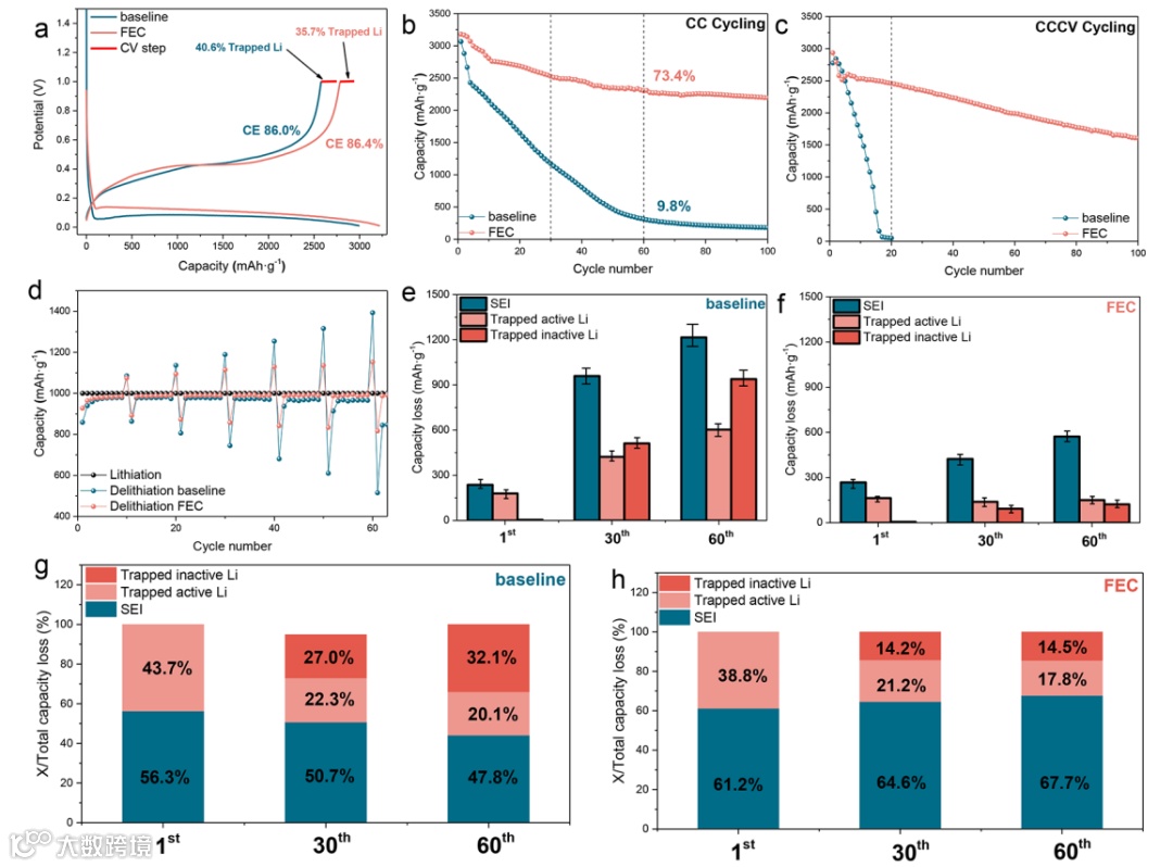 图2. (a) 在不同电解液中的首次充放电曲线,(b) 恒电流循环, (c) 恒流+恒压循环,(d) 10次恒流+1次恒压放电,(e-h)硅负极在有无FEC条件下SEI和其它锂消耗情况对比。