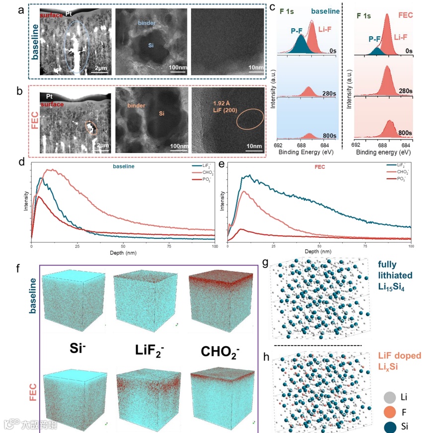 图3. (a)不同电解液中恒流嵌理后硅电极的FIB-HRTEM图像,(b) XPS结果,(c) 恒压脱锂后。TEM图像, (d,e) 不同深度的成分变化情况, (f-h) 有无FEC条件下LiF在硅负极中的分布结果模拟.