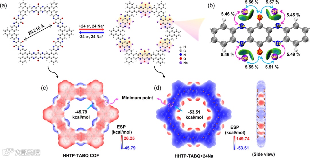 图2. HHTP-TABQ COF重复单位的DFT计算:(a)HHTP-TABQ COF负极的储钠机理(b)通过IGMH分析的部分钠化HHTP-TABQ COF结构的有色等值面(c,d)在不同钠化状态下HHTP-TABQ COF的分子静电势