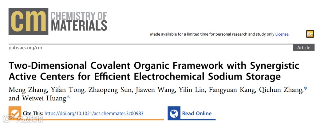 Meng Zhang, Yifan Tong, Zhaopeng Sun, Jiawen Wang, Yilin Lin, Fangyuan Kang, Qichun Zhang*, and Weiwei Huang*. Two-Dimensional Covalent Organic Framework with Synergistic Active Centers for Efficient Electrochemical Sodium Storage. Chem. Mater. 2023, DOI: 10.1021/acs.chemmater.3c00983.