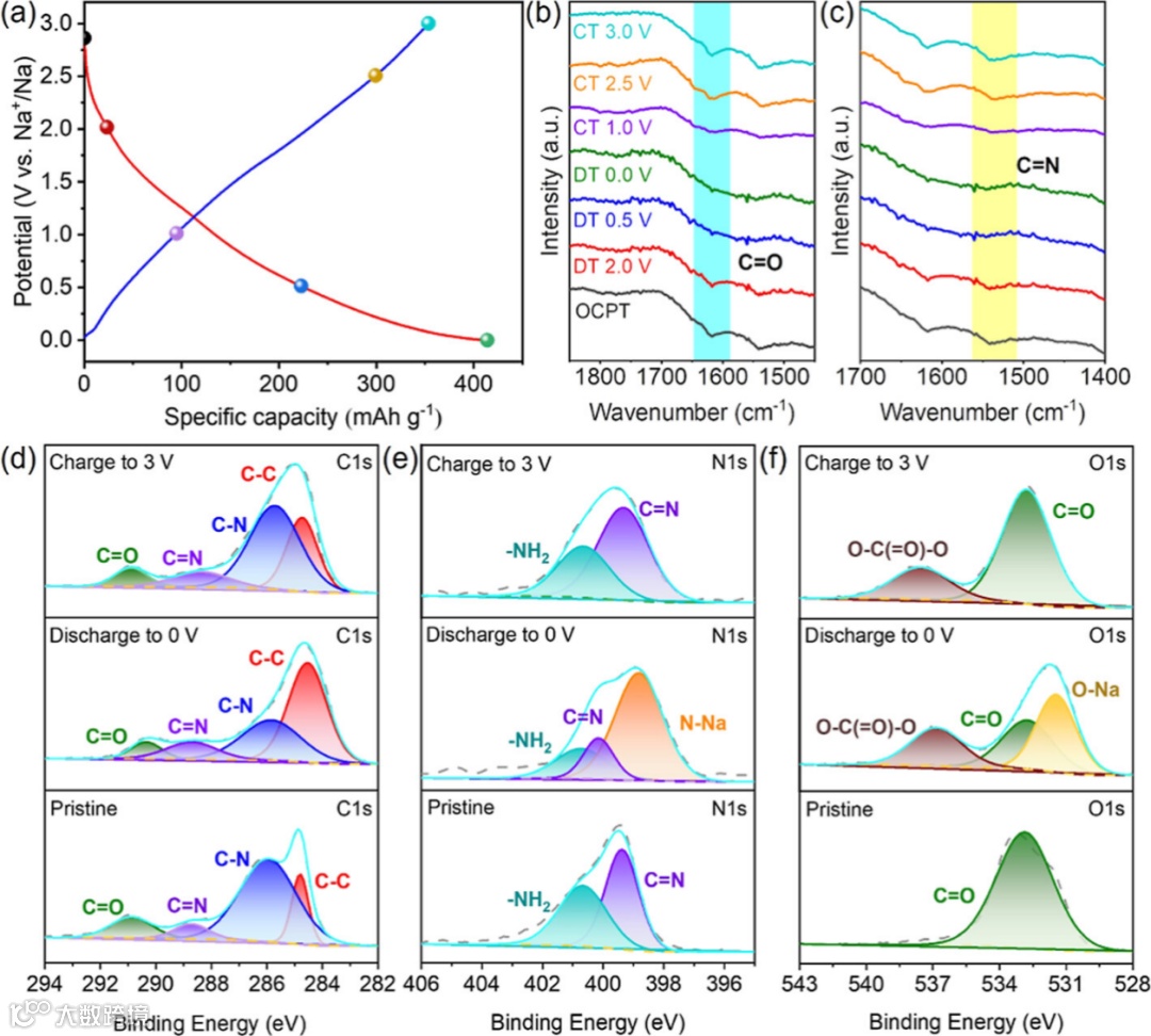 图4. HHTP-TABQ COF负极钠化/去钠化过程中的C═N和C═O活性位点的结构演变:(a)0.1 A g-1电流密度下的恒电流充/放电曲线(b,c)不同电压下HHTP-TABQ COF负极的非原位FTIR光谱(d,e,f)不同充/放电阶段钠离子电池的非原位XPS表征