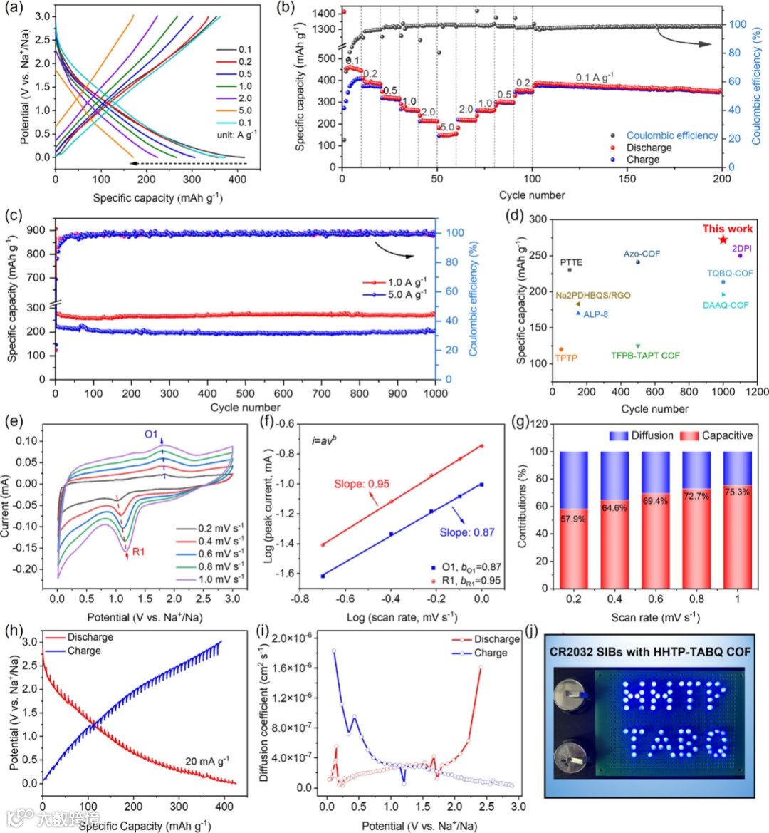 图3.(a)倍率充放电曲线(b)倍率性能(c)HHTP-TABQ COF负极在1.0和5.0 A g-1电流密度下的超长循环性能和库仑效率(d)电化学性能对比(e)不同扫速下HHTP-TABQ COF负极的CV曲线(f)由峰值电流与扫速确定的斜率b值(g)不同扫速下赝电容和扩散控制的储存贡献(h)HHTP-TABQ COF负极的GITT曲线(i)Na+的扩散系数(j)基于HHTP-TABQ COF负极钠离子电池的应用