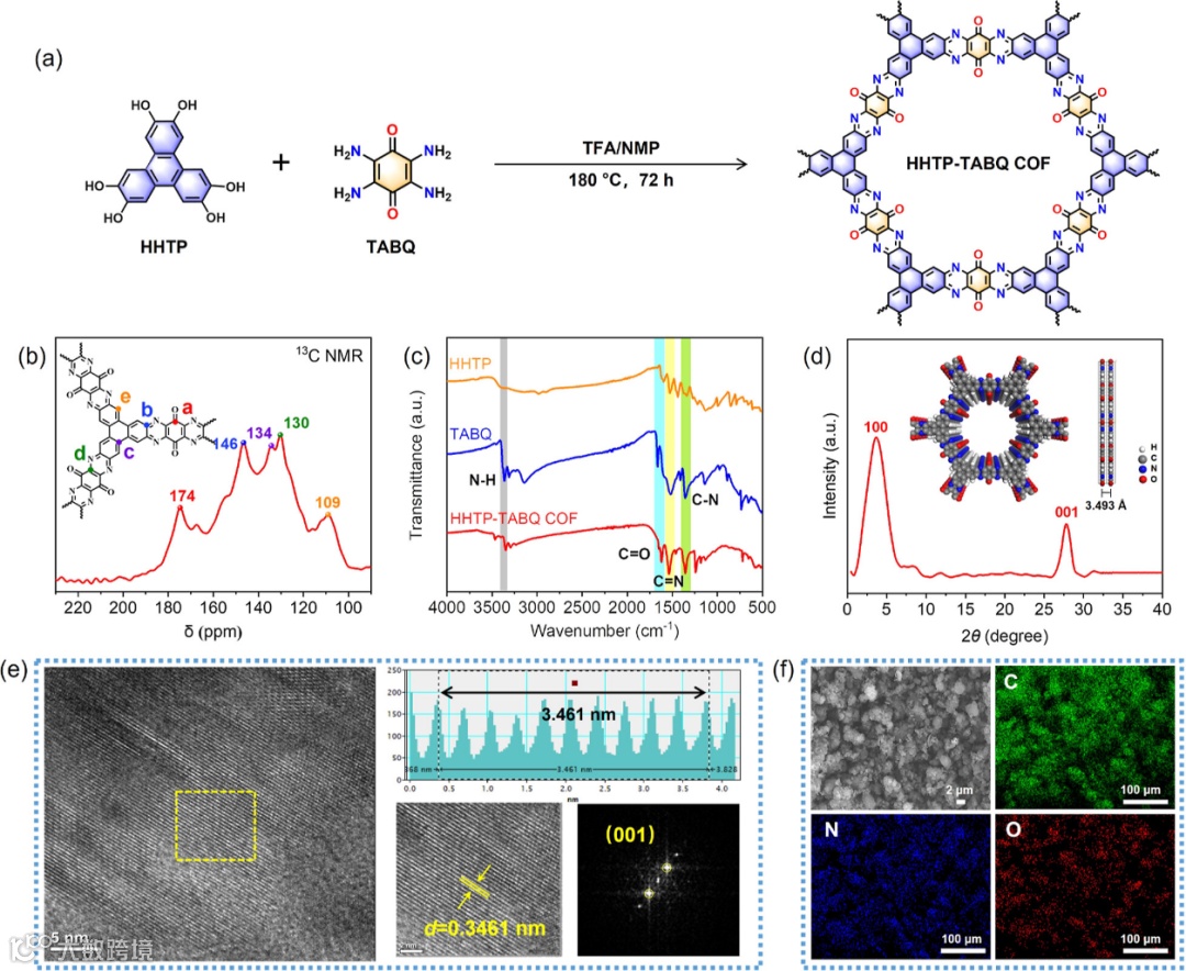 图1. HHTP-TABQ COF的合成与表征:(a)HHTP-TABQ COF的合成路线(b)固态13C NMR(c)FTIR(d)XRD(e)HRTEM及SAED图(f)HHTP-TABQ COF的SEM及Mapping图