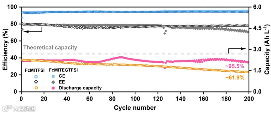 在25 mA cm-2 时,基于 FcMITFSI 的电池在 200 次循环后容量保持率仅≈61.9%,而基于 FcMITEGTFSI 的电池具有优异循环性能,总体放电容量保持率≈95.5%,相当于每个循环的容量保持率≈99.98%(图2)。此外,基于FcMITEGTFSI的电池具有优异的倍率性能,在高浓度下也表现出相对较好的循环性能(图3)。