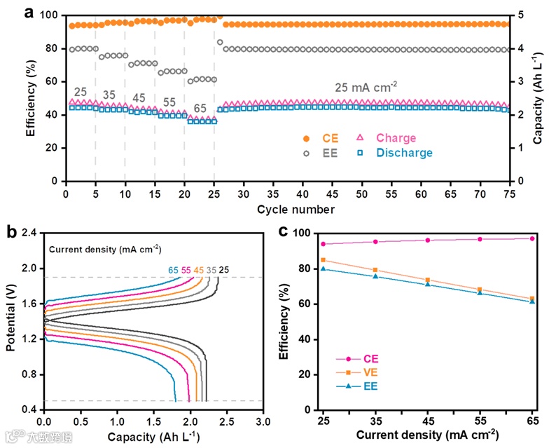 图 3. (a)基于 FcMITEGTFSI 的电池的倍率性能,(b)恒电流充放电曲线,(c)电池在不同电流密度下的CE、VE和EE值