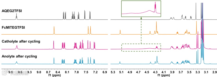 200 次充放电循环后,基于 FcMITFSI 的液流电池负极电解液中产生沉淀,说明其在充放电过程中与带负电物质发生了反应,导致其容量衰减。基于 FcMITEGTFSI 的液流电池电解液仍为均匀液态,长低聚醚侧链的位阻作用阻碍了带负电荷物质对二茂铁核的进攻,从而保持其稳定性。循环后FcMITEGTFSI 电解液的 NMR 图谱(图4)未观察到明显杂质峰,表明 FcMITEGTFSI 具有优异稳定性。