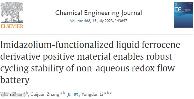 相关工作以“Imidazolium-functionalized liquid ferrocene derivative positive material enables robust cycling stability of non-aqueous redox flow battery”为题发表在Chemical Engineering Journal上。