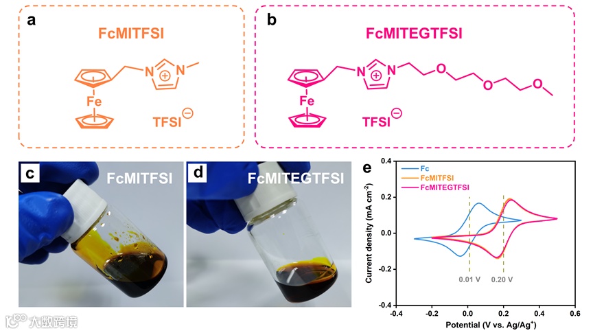 图1 (a,c)FcMITFSI 和(b,d)FcMITEGTFSI 的分子结构及溶解照片,1 mM 活性物质在 0.1 M TEATFSI/MeCN 中的 CV 曲线(e)