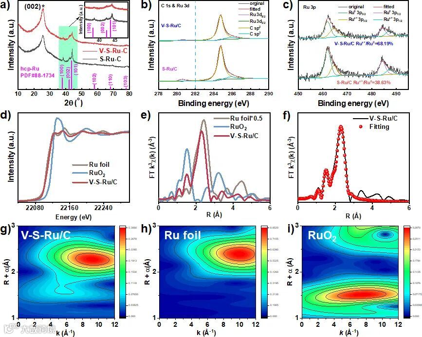 XRD进一步确认了Ru粒子中应力的存在。XANES显示目标催化剂缺陷与应力Ru纳米颗粒中Ru有着类似金属Ru的特性。FT-EXAFS 曲线中位于 1.50 和 2.30 Å 处的两个分离峰,分别对应于 Ru-C 和 Ru-Ru 键。另外, 有应力与缺陷的中 Ru-Ru 的键长比 Ru 箔中的键长(2.42Å) 更短,证实了晶格压缩的存在。拟合结果表明, 有应力与缺陷的中 Ru-Ru 键的配位数为 4.9,低于 Ru 箔的配位数(即 12)。Ru-Ru 配合度的降低进一步证实了有应力与缺陷的Ru/C 中可能存在丰富的结构缺陷,这与之前提到的 AC-HAADF-STEM 结果一致。此外,还对 Ru K-边 EXAFS 进行了小波变换(WT)处理,结果显示“有应力与缺陷的Ru/C”与“Ru箔”相比,其小波变换最大强度有所偏移,表明催化剂中存在结构缺陷。
