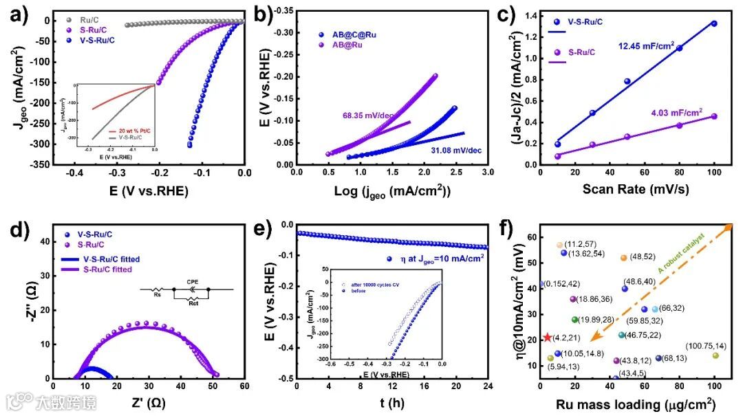 电化学LSV曲线(图4a),Tafel曲线(图4b),电化学活性面积(图4c)及EIS曲线(图4d)显示合成的V-S-Ru/C催化剂有着最好的析氢活性,最快的析氢动力学,最大的活性面积及最低的电荷转移阻抗值。长时间的CV循环测试(图4e),恒电流测试(图4e插图)结果均表明催化剂有着良好的HER稳定性。