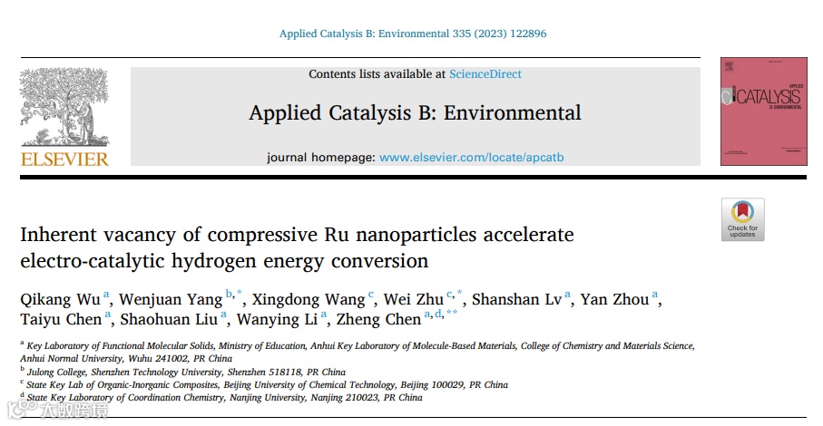 近日,来自安徽师范大学的陈郑教授,深圳技术大学的杨文娟研究员及北京化工大学的朱威教授合作,在国际知名期刊Applied catalysis B: Environmental上发表题为“Inherent vacancy of compressive Ru nanoparticles accelerate electrocatalytic hydrogen energy conversion”的研究文章。该研究文章分析了缺陷对于具有应力结构的Ru纳米颗粒的催化活性的影响。