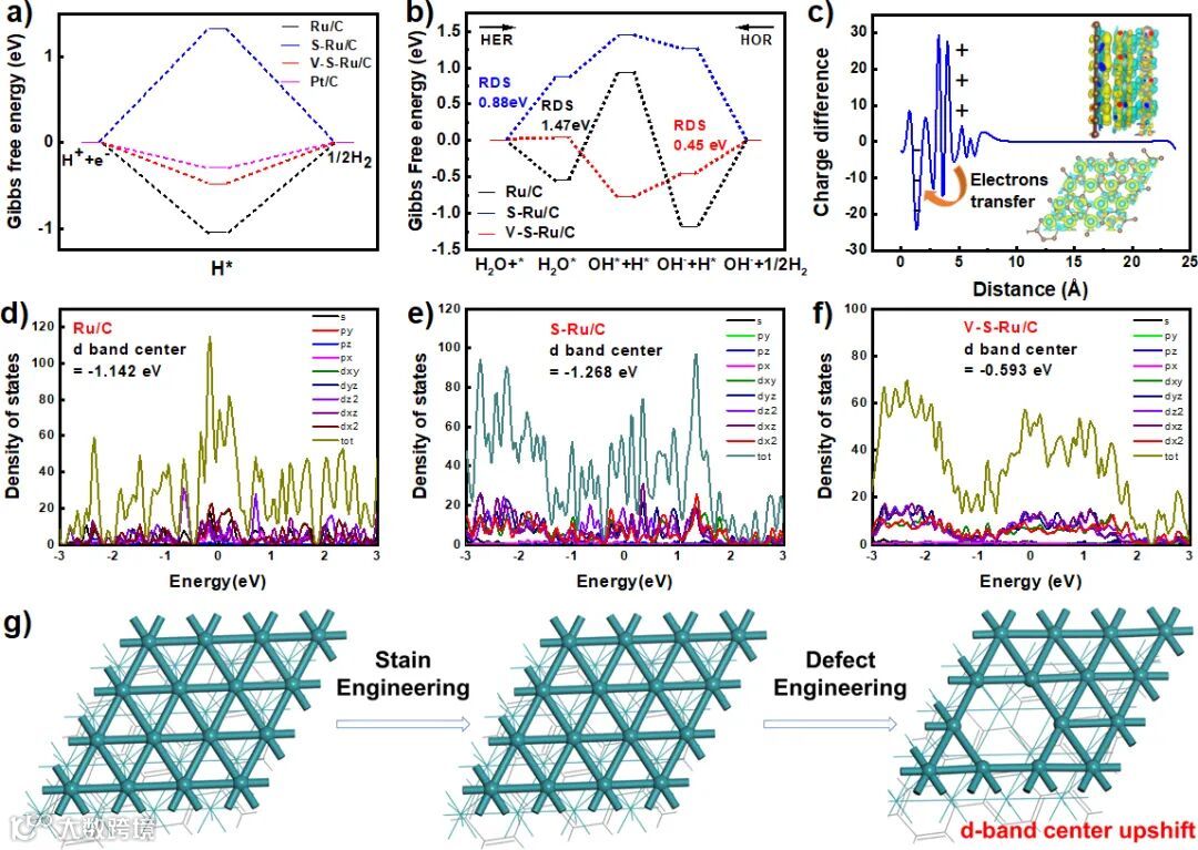 理论计算结果显示,V-S-Ru/C具有适宜的氢吸附自由能,最低的决速步能量。电荷密度差表明了 C 和 Ru 之间的界面电荷转移方向,这与 XPS所观测结果一致。态密度计算结果显示,Ru原子的d轨道对最外层轨道的贡献更大。单纯的应力使得d带中心略微下移,而同时存在缺陷的情况下,会使得d带中心极大的上移。d 带中心的上移有利于 H2 的吸附。随着d-σ杂化反键轨道((d-σ)*)填充量的减少以及催化剂表面与吸附剂相互作用的稳定,d 带中心位置的向上移动, V-S-Ru/C 位点与中间体的结合能力从热力学角度提高,从而提高了 HER 和 HOR 活性。