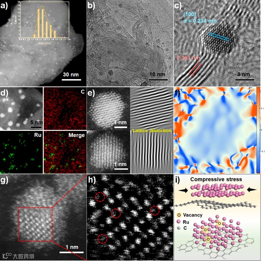 图 2 对碳基底上Ru纳米颗粒的应力与缺陷的系统表征与模型构建。