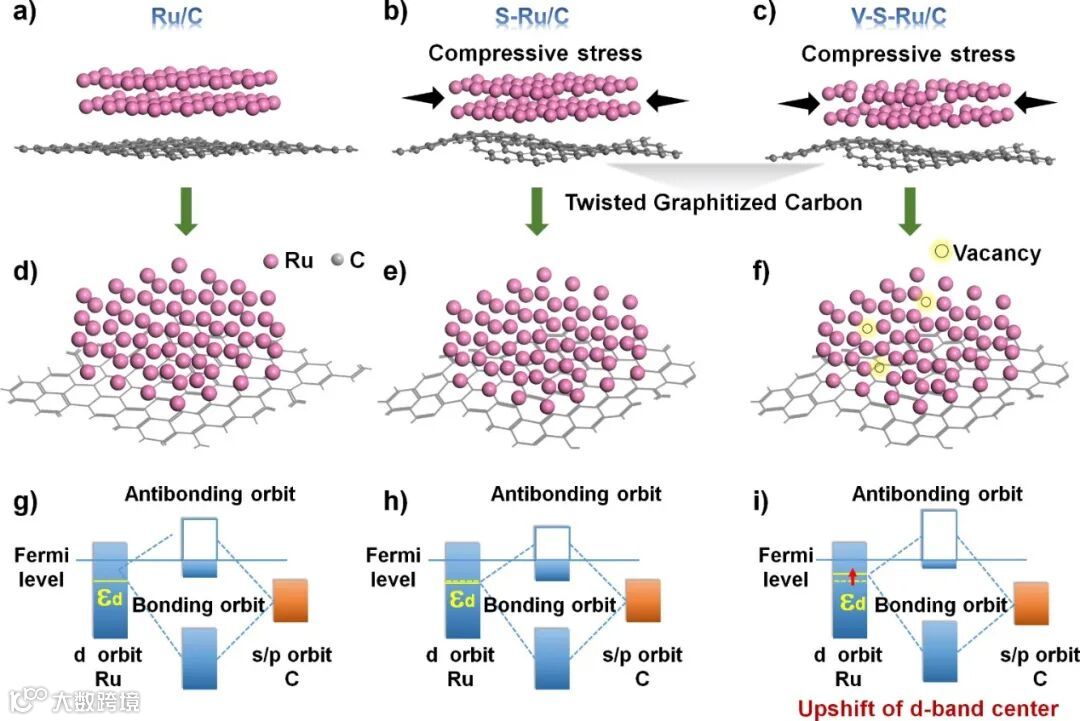 图1不同Ru基催化剂模型图:a、b、c) Ru/C、S-Ru/C、V-S-Ru/C的测视图; d、e、f) Ru/C、S-Ru/C、V-S-Ru/C的俯视图; g) Ru/C, h) S-Ru/C和i) V-S-Ru/C的d带中心移动图。
