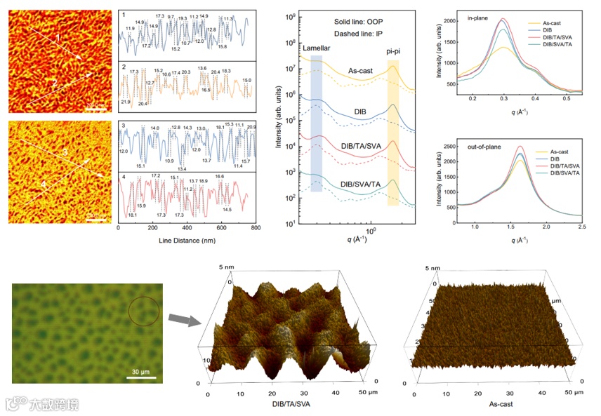 刘烽团队以最先进的PM6:PY-IT全聚合物共混物为基础,诱导纳米/微米尺寸的分层形貌。其中,相变固体添加剂1,4-二碘苯(DIB),热退火和溶剂蒸汽退火(SVA)后处理的协同作用是形貌优化的关键。通过控制溶剂和固体添加剂的去除,可以更有效地控制共轭聚合物的结晶,从而精细调控聚合物的结晶动力学。获得了高结晶度的互联双纤维网络形态,有利于加快激子分离和提升载流子传输。通过GIWAXS等形貌表征手法证明了顺序优化策略下,DIB/TA/SVA器件的在纳米纤维结晶上的优越性,至此,也解决了困扰全聚合物电池形貌调控的难题。
